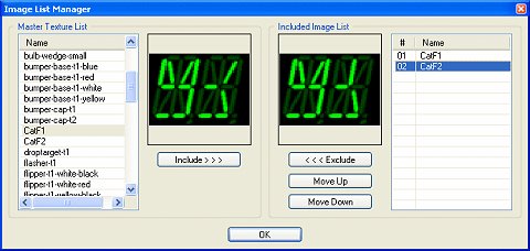 Das Fenster ist in zwei Bereiche geteilt: die Master Textur List und die Included Image List. In der Master Textur List finden Sie alle Texturen/Grafiken, die mit dem Textur Manager in Ihren Spieltisch importiert wurden. Wenn Sie dort einen Eintrag wählen, wird eine Vorschau der Entsprechenden Grafik gezeigt.