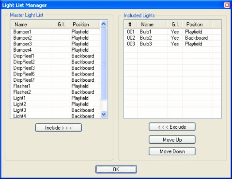 Dieses Dialogfenster ist wieder in zwei Bereiche unterteilt: die Master Light List und Included Lights.Die linke Master Light List zeigt alle Lichter, die sich auf Ihrem Spieltisch und/oder der Backbox befinden, die Spalte "Position" gibt Aufschluß über den Ort des Lichtes, entweder Spieltisch oder Backbox. Die Spalte G.I. (General Illumination) zeigt, ob es sich um eine allgemeine Beleuchtung handelt oder nicht. Das erleichtert die sinnvolle Auswahl der Lichter für einen geplanten Effekt.