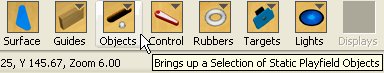 Es gibt eine ganze Menge Objekt-Typen in Future Pinball, auf die Sie über die Objektleiste am unteren Rand des Editors zugreifen können. Diese Objektleiste ist in mehre Objekttypen gegliedert, die jeweils ähnliche oder vergleichbare Objekte enthalten. So enthält z. B. die Gruppe Guides (Führungen) Walls (Wände), WireGuides (Drahtführungen) und Plastikführungen. Wenn Sie auf einen dieser Gruppen-Schaltflächen klicken, werden alle darunter befindlichen Objekt-Schaltflächen senkrecht nach oben ausgefahren, so dass Sie auf diese Zugriff haben.