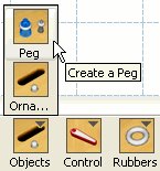 Klicken Sie auf die Objects Schaltfläche und dann auf die Schaltfläche Peg der Popup-Schaltflächenliste. Der Cursor verändert sich anschließend zu einem Fadenkreuz. Bewegen Sie nun den Cursor an die Stelle des Arbeitsbereiches, an der sie (in unserem Fall) den Peg plazieren möchten und klicken Sie dort. Falls Sie eine falsche Auswahl des Objekts getroffen haben, klicken Sie einfach auf die Select Schaltfläche der linken Haupt-Werkzeugleiste, um die Auswahl aufzuheben. |