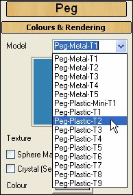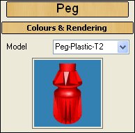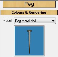 Wenn Sie auf Dropdownliste für das Modell klicken, werden alle Modelle diesen Typs aufgelistet, zeigt in unserem Fall also nur Pegs. Automatisch wird beim Plazieren eines Objektes immer das erste dieser Liste eingefügt. Aktuell ist das ein Metall-Nagel. Nun möchten wir jedoch einen Peg verwenden, der zum Tragen so genannter Plastics verwendet oder später von einem Gummiring umschlossen wird. Deshalb wählen wir nun aus der Dropdownliste den Peg-Plastic-T2. |
