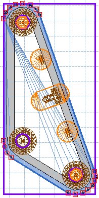 Shapepoint-basierte Objekte wie z. B. Surfaces können in der X- oder Y-Achse gespiegelt werden. Eine vorteilhafte Option für diese Anwendung wäre beispielsweise, wenn Sie den linken Slingshot mit Pegs, Gummi, Lichtern und Surface fertiggestellt haben, können Sie den gesamten Slingshot per Maus-Auswahl-Box selektieren, kopieren und an einer anderen Stelle einfügen. Ein Rechtsklick auf die noch selektierte Kopie des Slingshots bietet in seinem Kontextmenü über Flip X die Möglichkeit, diesen zu spiegeln, so dass Sie damit schon gleich auch den rechten Slingshot fertiggestellt haben (vorausgesetzt, dass dieser das gleiche Erscheinungsbild haben soll).