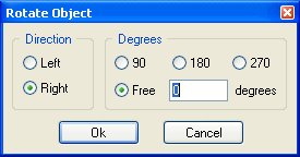 Der Richtungs-Radio-Button ( ) erlaubt es Ihnen festzulegen, ob das Objekt nach links oder rechts gedreht werden soll. Desweiteren können Sie einen der vordefinierten Winkel 90°, 180° oder 270° wählen oder einen freidefinierten Winkel in das Eingabefeld eintragen. Ein Klick auf OK führt die Drehung aus.