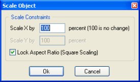 Eine weitere Option, die auf Shapepoint-basierte Objekte angewendet werden kann ist das Skalieren (Verändern der Größe). Markieren Sie das Objekt per rechtem Mausklick und wählen Sie im Kontextmenü Scale. Im folgenden Dialogfenster können Sie für die X- bzw. Y-Achse den gewünschten Wert für die Skalierung in % angeben.