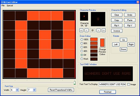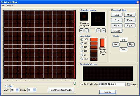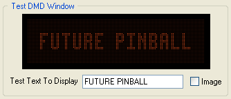 Das Testfenster zeigt Ihnen eine Vorschau der DMD Schrift in einer 128 x 32 Pixel großen Punkt-Matrix, womit Sie das Erscheinungsbild, wie es später beim Spielen des Flippers aussieht, beurteilen können.