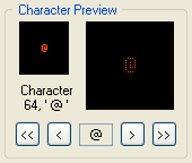 Diese Zeichen-Vorschau ermöglicht Ihnen zu wählen, welches Zeichen (zwischen 'Leerzeichen' und '~' ingsg. 126 Zeichen) Sie in dem oben beschriebenen Fenster formen möchten. Die Vorschau umfasst 2 unterschiedlich große Ansichten und die Nummer des ausgewählten Zeichens. Über die Navigations-Schaltflächen können Sie zum nächsten bzw. vorigen Zeichen wechseln, ebenso wie zum ersten und zum letzten. |