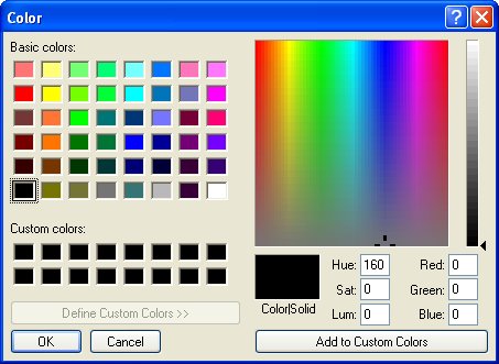 Der größte Teil der Future Pinball Komponenten stellt in wenigstens einer Einstellungs-Option ein Farbauswahlfeld . Ein Klick auf dieses öffnet das Standard-Farbwahl-Dialogfenster: