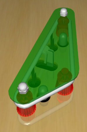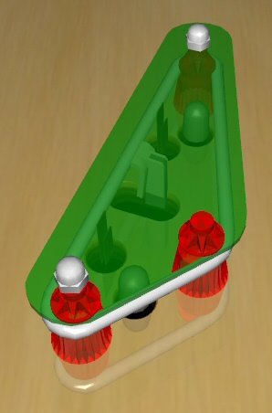 Aus diesem Grund ist auch hier die richtige Reihenfolge in der Anordnung der Objekte sehr wichtig. Das folgende Beispiel zeigt zwei Slingshot-Anordnungen. Die erste ist mit einer fehlerhaften Reihenfolge der Pegs erstellt, da sie über der Surface des Slingshots liegen. Hier wurde der hintere Peg zuerst erstellt, dann die Surface und zuletzt die beiden vorderen Pegs. Wenn Sie nun die Surface markieren und per Rechtsklick und Send to Front diese in den Vordergrund verschieben, wird diese als letztes gerendert und der Fehler verschwindet, wie in der zweiten Abbildung zu sehen ist.