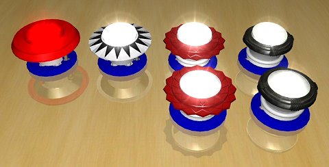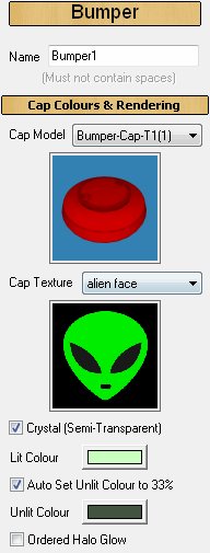 ... ermöglicht die Zuordnung einer Textur für die Kappe. Ein Klick auf dieses Listenfeld zeigt alle Grafiken, die zur Auswahl zur Verfügung stehen. Die Auswahl einer Textur wird als Vorschau angezeigt. Für Crystal-Kappen (klar durchscheinend) benötigen Sie keine Textur. Achten Sie darauf, dass Sie die passende Textur zur Bumper-Kappe wählen. Beispielsweise gehörte zur Kpappe T2(1) die Textur bumper-cap-t2.