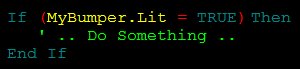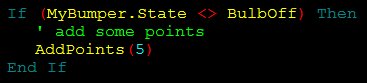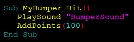 Wenn die Kugel die Trigger-Schürze des Bumpers trifft, tritt das so genannte _Hit Ereignis ein, wenn es sich um einen Active Bumper handelt, es sei denn, der Status des Bumpers steht bereits auf SolenoidOn (z. B. durch Anwenden der Methode .SolenoidOn). Auch wenn die globale Variable fpTilted, die den Spieltisch als "getilt" markiert, wahr ist, wird das _Hit Ereignis ignoriert.