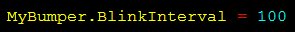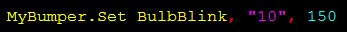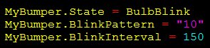 Diese Eigenschaft stellt den Status der Glühbirne des Bumpers ein. Wenn der Status auf BulbBlink gesetzt wird, dann geht das Birnchen entsprechend dem eingestellten Interval an und aus. Ist für Blink Pattern ein Muster eingetragen, wird dieser Wert abgearbeitet.