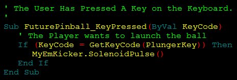 Diese Methode wird die Spule anziehen lassen und der Hammer des EM-Kickers schlägt nach vorne, um die Kugel wegzustoßen. Der Zeitpunkt zwischen dem Auslösen eines Triggers vor dem Kicker und dem Anziehen der Spule muss sehr bedacht gewählt werden, da die Kugel manchmal beim Eintreffen vor dem Hammer noch etwas hüpfen kann, abhängig vom Schwung, mit dem die Kugel dort ankommt. Ansonsten könnte der Hammer nämlich ins Leere schlagen und die Kugel bleibt dort liegen. Es ist nicht möglich, den Status SolenoidOn() permanent zu halten, da dieser die SolenoidPulse() Methode aufruft.