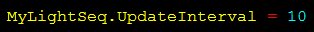Diese Einstellung ermöglicht Ihnen die Veränderung der Geschwindigkeit, in der der Light Sequencer eine Effekt-Sequenz ablaufen lässt. Je geringer der Wert, um so schneller erfolgt der nächste Schritt im gewählten Effekt. Zum Verdeutlichen: Stellen Sie sich eine Reihe mit Lichtern vor. Die Effekt-Sequenz beginnt damit, dass das erste Licht an geht. Der Zeitraum bis zum Anschalten des nächsten Lichtes ist die hier angesprochene Periode in Millisekunden. Das UpdateInterval muss mindestens 5 Millisekunden betragen.