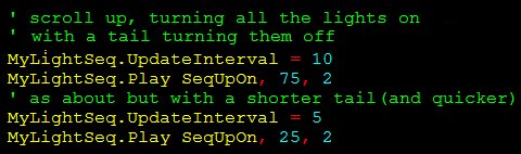 Wenn Sie einee .Play() Methode erstellen, können Sie eine ganze Reihe verschiedner Effekte hintereinander Packen, wie es in obigem Beispiel-Code der Fall ist. Der Light Sequencer übernimmt dann die Kontrolle über die ihm zugeordneten Lichter. Er wird alle angewiesenen Effekte der Reihe nach abarbeiten, bis die Warteschlange leer ist, was durch das Empty() Ereignis gemeldet wird, oder bis Sie den Light Sequencer über die Methode .StopPlay() stoppen. Danach haben Sie über das Script wieder die Kontrolle über alle Lichter, deren Zustand (ON, OFF, BLINK) wieder dem entspricht, bevor der Light Sequencer eingeschaltet wurde.