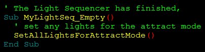Dieses Ereignis tritt ein, wenn der Light Sequencer alle angewiesenen Effekte mit allen Wiederholungen abgearbeitet hat. Für den normalen Spielablauf hat dieses Ereignis keine besondere Bedeutung, jedoch kann er hilfreich bei der Erstellung des Attract Modus sein. Im Attract Modus werden normalerweise bestimmte Muster über eine spezielle Gruppe von Lichtern ausgeführt, jedoch werden nach einer gewissen Zeit oft die gesamten Lichter des Spieltisches mit einbezogen. Sie können dieses Ereignis verwenden, um wieder zur normalen Animation der Lichter zurückzukehren.