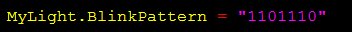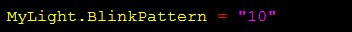 BlinkPattern definiert ein spezielles Blink-Muster, welches durch einen String ausgedrückt wird. Ein Muster wird durch die Ziffern 1 (ON) und 0 (OFF) beschrieben. BlinkPattern besteht aus mindestens zwei Ziffern, z. B. "10", "01", "11" oder "00" und können bis zu 32 Ziffern maximal haben. Eine aktuell bestehendes Muster wird durch die neue Definition überschrieben.
