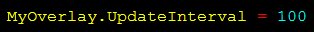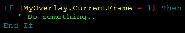 EndFrame: Wenn Sie möchten, dass dem Overlay für eine Animation Bilder zwischen dem ersten und letzten Bild der Liste zugeteilt werden, können Sie mit diesem Parameter das letzte Bild zuweisen. Jedes der zwischen StartFrame und EndFrame liegende Bild wird dann in die Animation eingebunden und wechselt in der mit .UpdateInterval definierten Geschwindigkeit. Sie können die Animation vorwärts oder rückwärts laufen lassen. Wenn der Wert außerhalb des gültigen Bereiches liegt, wird er ignoriert.