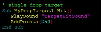 Diese Variable wird gesetzt, wenn die Kugel einen Drop Target trifft, und dieser nach unten fällt. Diese Variable können Sie benutzen, um zu überprüfen, ob ein Target getroffen wurde oder nicht. Wenn die Bank mehr als einen Target enthält, enthält die Variable erst dann TRUE (wahr), wenn alle Targets getroffen und versenkt wurden.