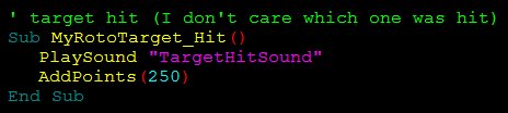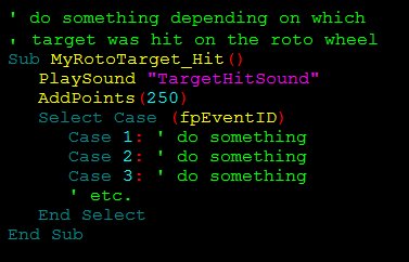 Dieses Ereignis tritt ein, wann immer die Kugel einen der Targets auf dem Roto Target trifft. In diesem Fall enthält die fpEventID die Nummer des Targets, der getroffen wurde, was es Ihnen ermöglicht target-speziefische Reaktionen zu realisieren.
