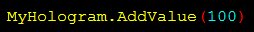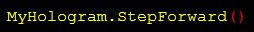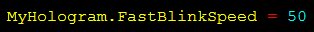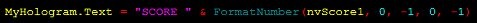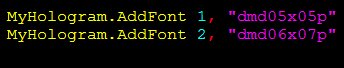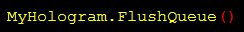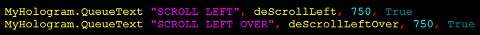 Mit dieser Einstellung können Sie Text im Hologramm-Display anzeigen. Wenn Anzeigen über die .QueueText() Methode anstehen, werden diese gelöscht. Eingebettete DMD Befehle werden sowohl für die .Text als auch für .QueueText() Methoden ausgeführt.
