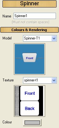 ... ermöglicht die Zuordnung einer Textur für das Modell. Ein Klick auf dieses Listenfeld zeigt alle Grafiken, die zur Auswahl zur Verfügung stehen. Die Auswahl einer Textur wird als Vorschau angezeigt. Tip: Sie können die Textur für den von Ihnen gewählten Spinner exportieren (Textur Manager) und die weiße Fläche der Textur für Vorder- und Rückseite nach Ihren Wünschen gestalten und anschließend re-importieren.