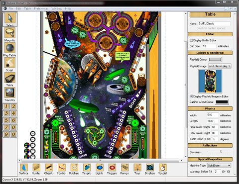 Der Spieltisch (Spielfeld) ist der Teil des Flippers, der die Flipper-Finger enthält und auf dem die Kugel rollt. Er ist für gewöhnlich mit einer Grafik belegt, die das Thema des Flippers unterstreicht. Die Schaltfläche zur Auswahl der Spieltischansicht im Editor befindet sich in der Werkzeugleiste am linken Bildschirmrand. In diesem Bereich können Sie auch in die Translite- (Backbox) Ansicht umschalten. Entsprechend der gewählten Ansicht stehen an der unteren Objektleiste die jeweils plazierbaren Objekte zur Verfügung.