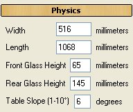 In diesem Feld können Sie die Höhe des Glases über dem vorderen Bereich des Spielfeldes definieren. Werte von 40 bis 300 Millimeter sind möglich. Dieser Wert kann nicht höher sein als die Rear Glass Height. Falls der Wert höher ist, wird die Höhe auch auf das Rear Glass Height übertragen. Bei älteren Flippern hat das Glas vorne wie auch hinten die gleiche Höhe über dem Spielfeld. Bei modernen Flippern ist es jedoch hinten höher als vorne und weist dadurch ein deutliches Gefälle auf.